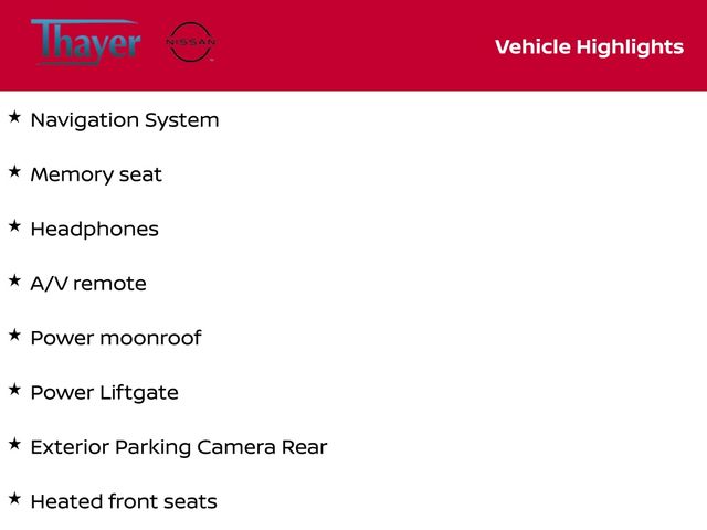 3rd row seats: split-bench, A/V remote, Exterior Parking Camera Rear, Headphones, Heated front seats, Memory seat, Navigation System, Power Liftgate, Power moonroof.