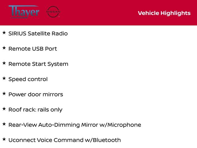 1-Yr SiriusXM Radio Service, Heated front seats, Power door mirrors, Rear-View Auto-Dimming Mirror w/Microphone, Remote Start System, Remote USB Port, Roof rack: rails only, SIRIUS Satellite Radio, Speed control, Tilt steering wheel, Uconnect Voice Command w/Bluetooth.