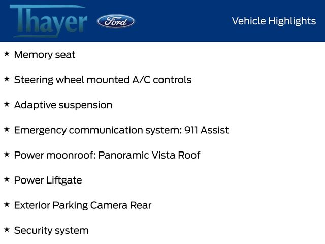 110V/150W AC Power Outlet, Adaptive suspension, AppLink/Apple CarPlay and Android Auto, Emergency communication system: 911 Assist, Exterior Parking Camera Rear, Heated front seats, Heated steering wheel, Memory seat, Power Liftgate, Power moonroof: Panoramic Vista Roof, Prem Lthr-Trimmed Heated/Cooled Bucket Seats, Security system, Steering wheel mounted A/C controls, Turn signal indicator mirrors, Ventilated front seats, Voice-Activated Touchscreen Navigation System.